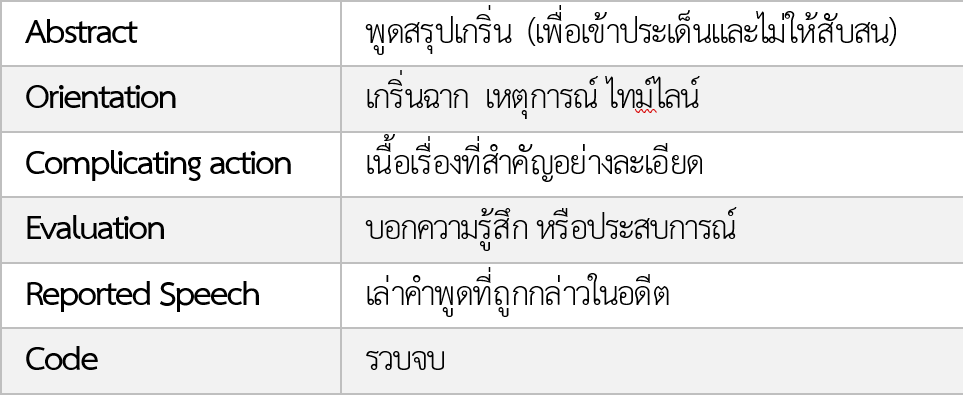 มี 2 ทฤษฎี ที่ใช้เป็นเกณฑ์หลักๆในงานวิจัยชิ้นนี้ คือทฤษฎีของ Labov(1972) เเละของของ Hopper(1979) โดย Labov เเบ่ง narrative structure ออกเป็น 6 องค์ประกอบ